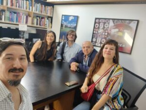 La investigadora fue recibida por el coordinador del grupo, Gabriel Chapunov; la secretaria, Valeria Romina González; y el Prof. Carlos Villulla, integrante del GEEyN y titular de la Cátedra de Derecho de la Minería y Energía (FCJyS-UNLP). Estuvo acompañado por Roberto Cadenas, también integrante de dicha cátedra. La convocatoria de ambos a la reunión se relaciona con su experiencia como parte del equipo docente del primer Seminario de Investigación en Derecho Espacial y Política Espacial, un curso de 17 clases dictado en 2024 que concluyó con la presentación de tesinas de grado.