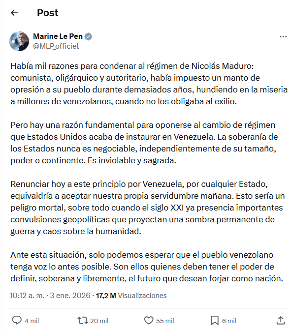 Esta posición no es sostenida por gobiernos socialistas o dirigentes de “izquierda” o marxista que puedan tener algún tipo de afinidad con la administración de Nicolás Maduro -actualmente de Delcy Rodríguez-, sino que también es esgrimida por los movimientos nacionalistas o de la “derecha” europea que entienden la peligrosidad de legitimar los hechos ocurridos el 3 de enero. En este sentido, Marine Le Pen, dirigente de la “Agrupación Nacional”partido político francés asociado a la “extrema derecha”, el conservadurismo, el liberalismo económico, el nacionalismo y la antiinmigración, ha declarado lo siguiente en su red social en razón de la intervención estadounidense en Venezuela: